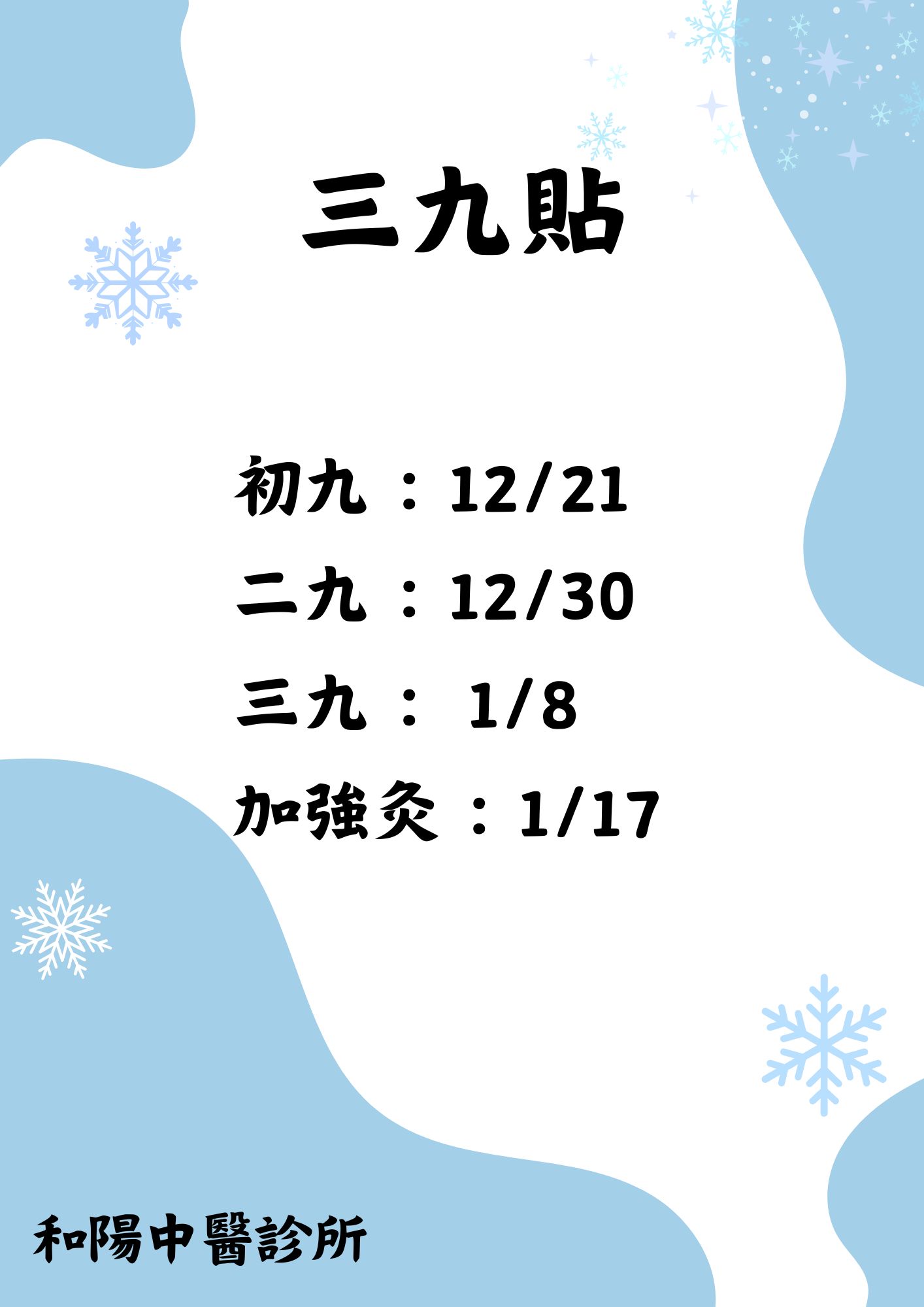 三九貼 初九:12/21 二九:12/30 三九:1/8 加強灸:1/17